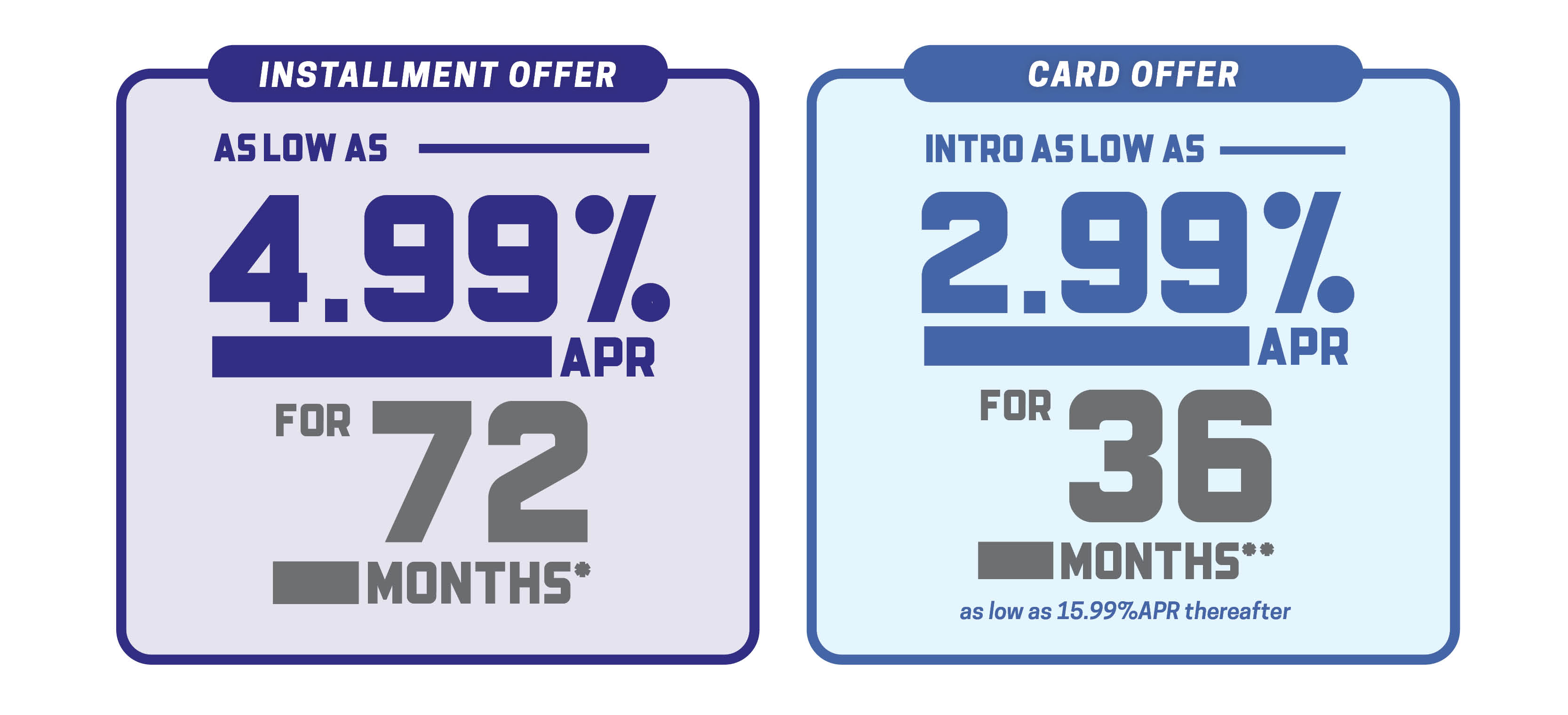 INTRO AS LOW AS 6.99% APR FOR 24 MONTHS, AS LOW AS 15.99% APR THEREAFTER1
